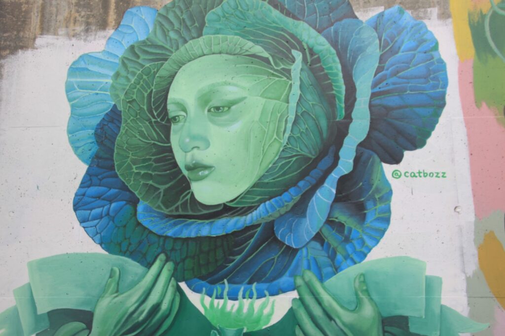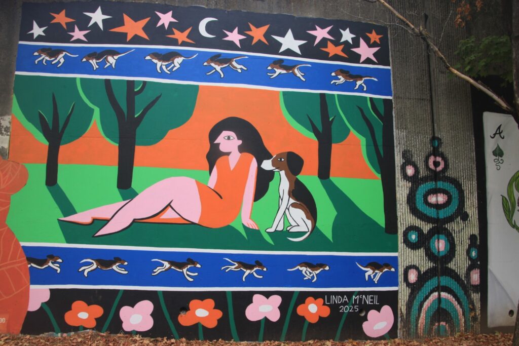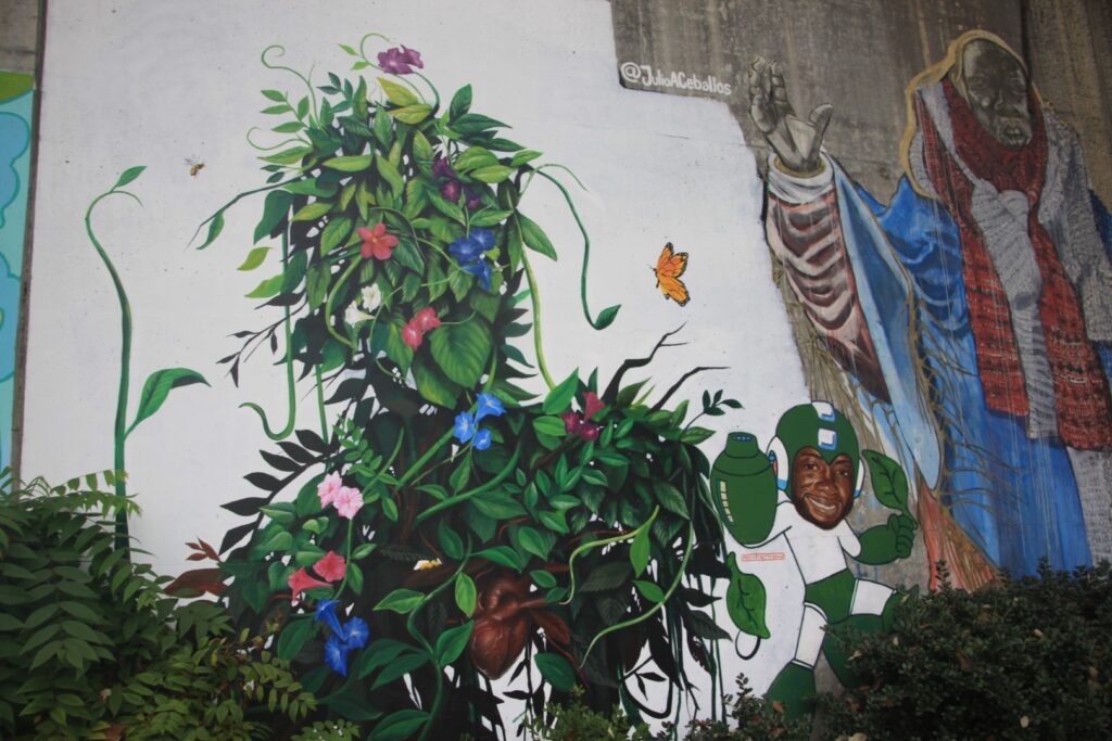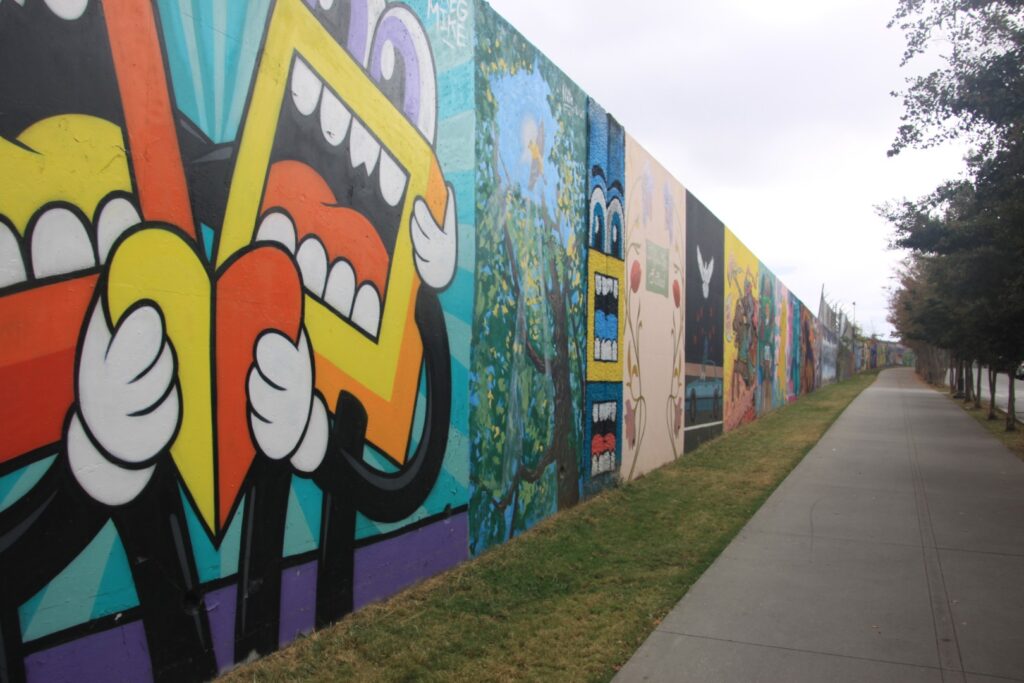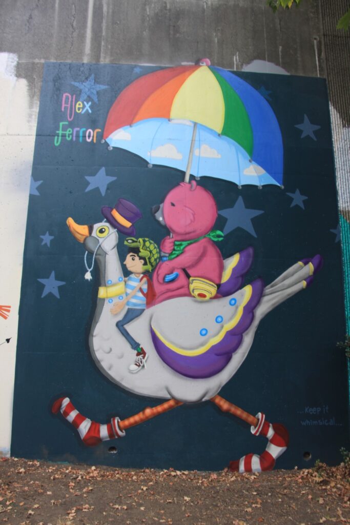 In Cabbagetown hat die Wylie Street eine Mauer von den höher liegenden Bahngleisen, auf der über 1 km Länge tolle Graffittis zu sehen sind. Eins ist von Julio. Die Bilder haben wir uns am nächsten Tag genauer angesehen.