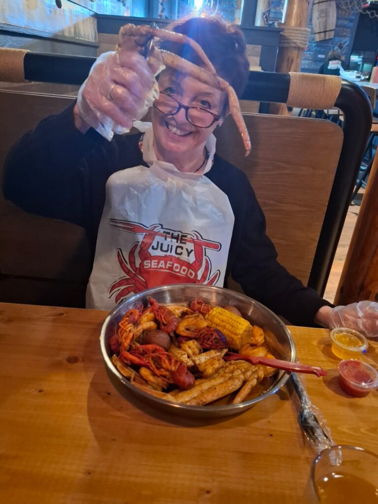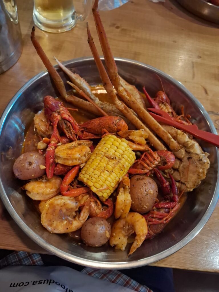 Abends waren wir in einem Seafood-Restaurant. Der Teller mit Hummer, Krabben und Krebsen war wirklich lecker. Und damit man sich nicht zusaut, gab es Einmalhandschuhe und eine Plastikschürze.