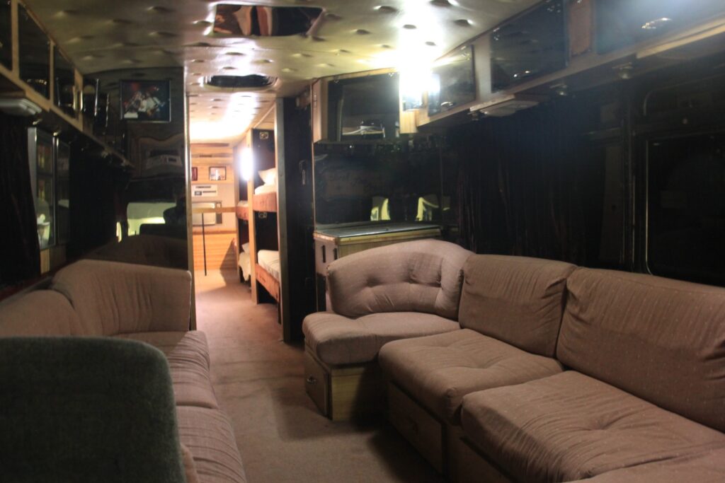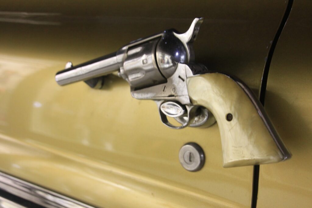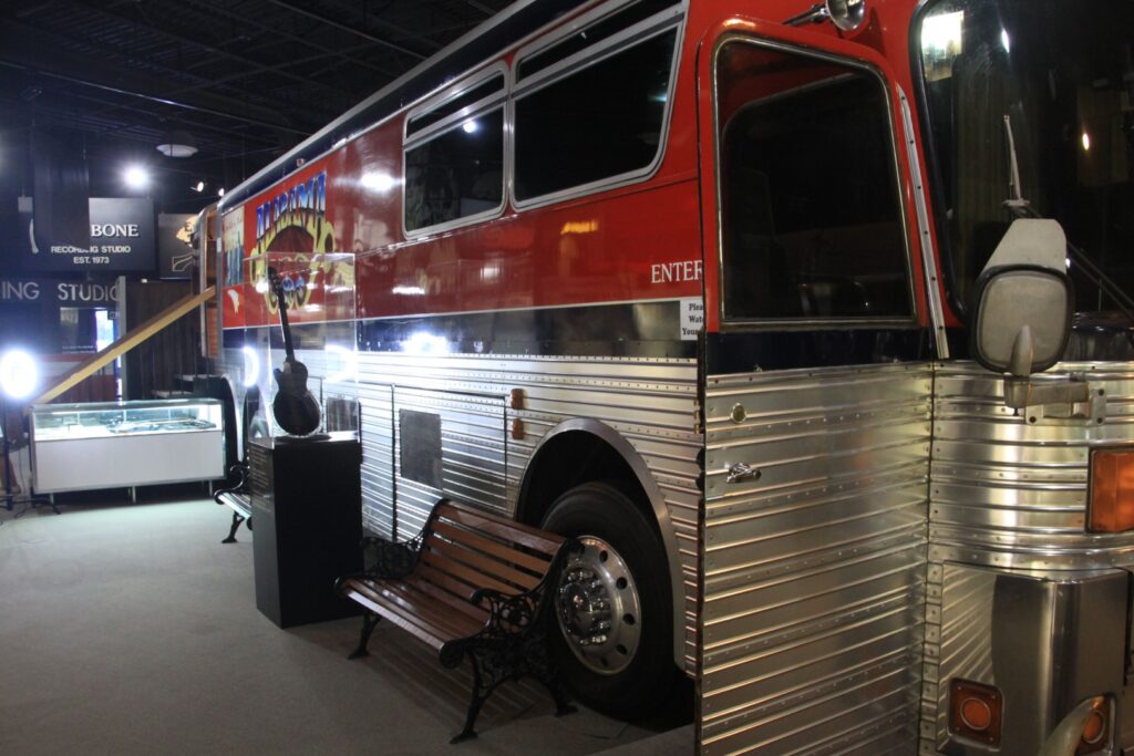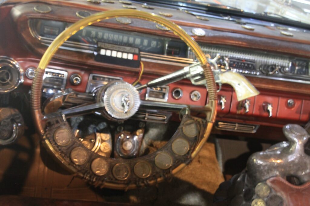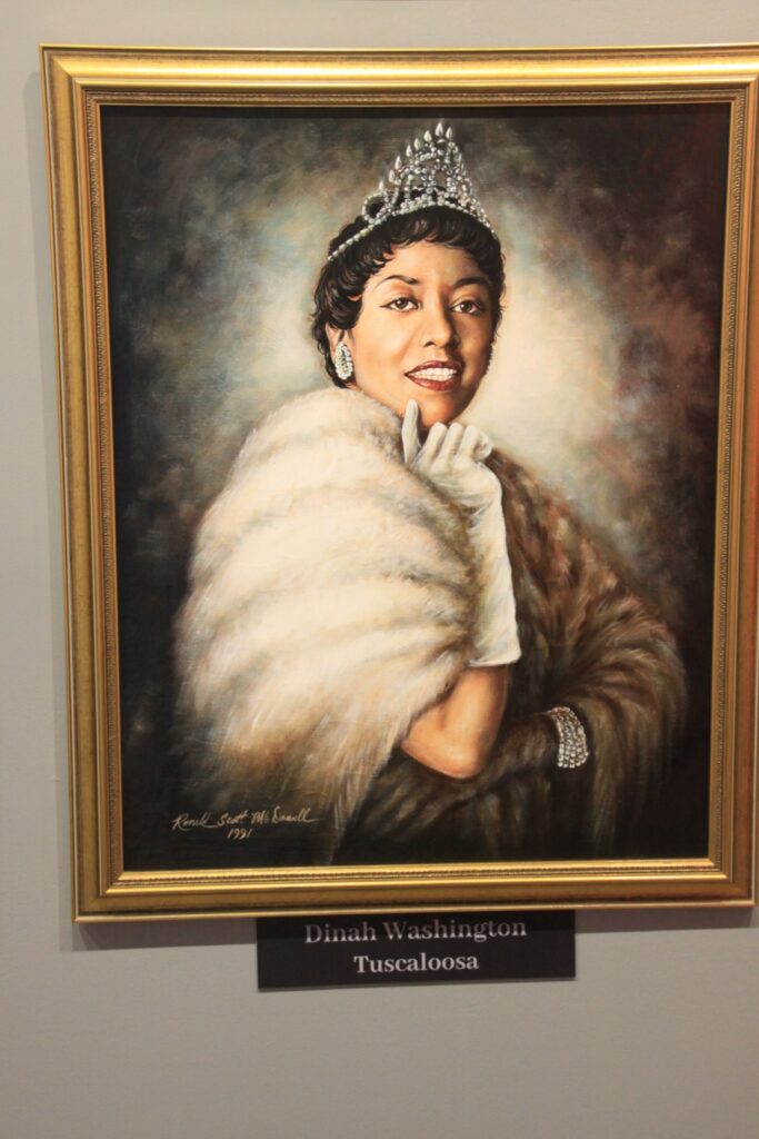 Dann waren wir in der Music Hall of Fame, wo an viele berühmte Musiker, die mit Alabama in Verbindung stehen, gewürdigt werden. Auf dem Portrait ist Dinah Washington mit Pelz und Diadem. Auch ein Tourbus war zu sehen, die Bilder zeigen ihn von außen und von innen. Dort schliefen bis zu 3 Leute übereinander in Schlafkojen. Der Cadillac hatte viele Bauteile durch Pistolen ersetzt – ein scharfes Teil. Türgriff war eine Pistole, der Schaltknüppel ebenso…